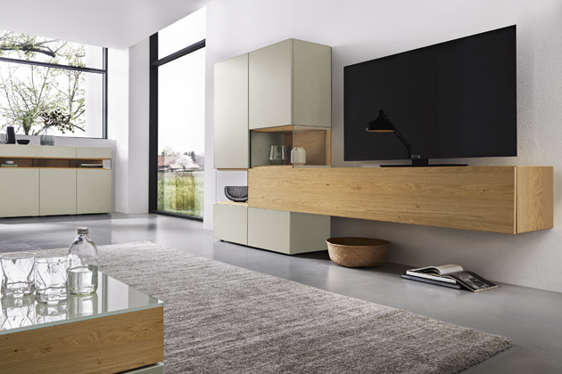 Minimalistické pojetí obývací stěny Neo (hülsta) v kombinaci dřeva, laku a skla, cena dle zvolené konfigurace, www.homestyle.cz