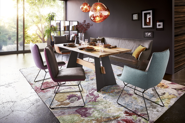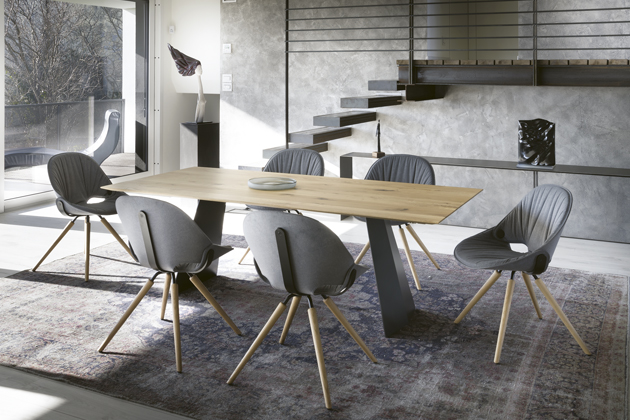 Stůl T1001 a židle 1201 z kolekce Wiiing (Koinor), dřevo, kov, textilie a kůže, cena stolu od 46 830 Kč, cena židle od 16 550 Kč, www.homestyle.cz
