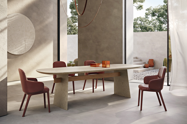 Jídelní stůl Adam (Natuzzi Italia), design Marcel Wanders studio, dřevo, medový jasan, leštěný kámen, ve dvou velikostech, cena od 144 510 Kč, www.natuzzi.cz