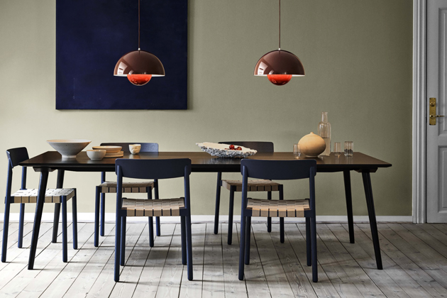 Jídelní stůl In Between SK5/SK6 (&Tradition), design Sami Kallio, lakovaný masivní dub a dubová dýha, židle Betty TK1 (&Tradition), lakovaný masiv, výplet z lněných popruhů, více barev, cena židle od 10 696 Kč, www.stockist.cz
