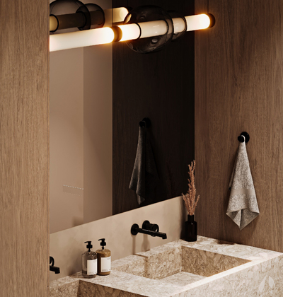Minimalistický, ale nikoli chladný designový návrh nechává promlouvat přírodní materiály a jeho přirozené struktury, jejichž vyznění umocňuje propracovanou světelnou scénou. V takovém pojetí není vlastně nic víc navíc potřeba. Možná jeden malý briliantík jako v případě elegantně oblečené ženy, který zde představuje závěsné svítidlo Luna 1 od Gabriela Scotta nebo volba baterií Angelo od značky Gessi.