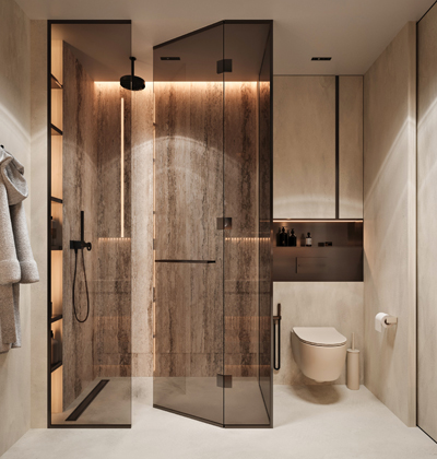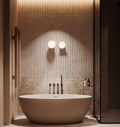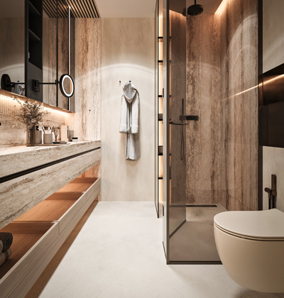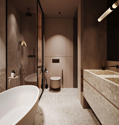 Majitelé si přáli prostory vycházející svým designem z přírodní barevné palety a materiálů. Od počátku je oslovoval vzhled přírodního travertinu, který však není ideální z hlediska údržby. Studio NACRT tak dostalo výzvu najít keramický obklad, který by splňoval nároky na kvalitu a snadný úklid a zároveň realisticky napodoboval vzhled přírodního kamene. Pro druhou koupelnu zvolilo teracový obklad a dlažbu v totožném barevném schématu. Efektního výsledku dosáhlo kombinací jejich hladkých a strukturovaných ploch.