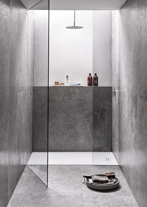 Foto: SikoSestra (Geberit), sprchová vanička v bílé barvě s břidlicovou strukturou, kompozitní materiál kamene a pryskyřice, 140 × 80 cm, cena 10 755 Kč → www.siko.cz