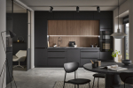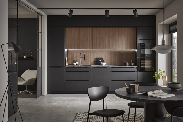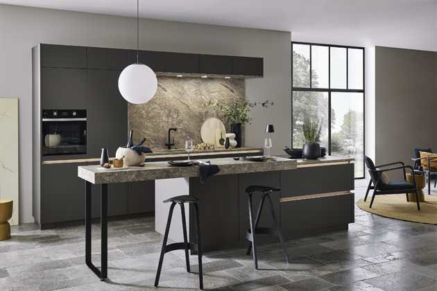 Groove Forest / Mossi (Livanza), kombinaci kuchyní se sametově černým povrchem a se vzhledem drážkovaného dřeva podtrhuje laminátová deska Mramor Nero → www.oresi.cz