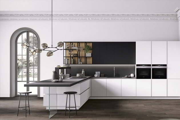 Time 07 (Arredo3), kuchyň v kontrastním černobílém pojetí matně lakovaných ploch nábytku s velkorysým poloostrovem → www.arredo3.com