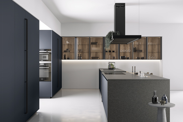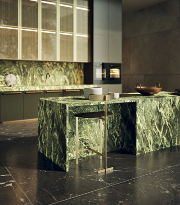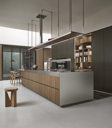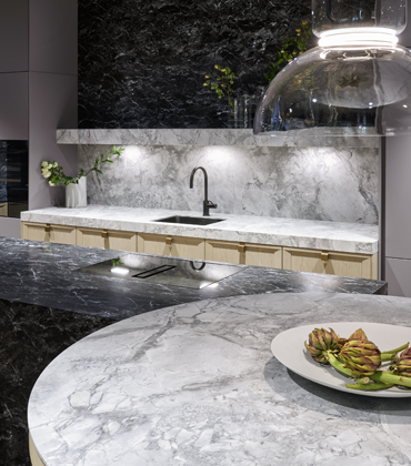 Sestava (SiaMatic), dýhované čelní plochy linky doplňuje povrch z mramoru Mondial ve světlém a tmavě šedém odstínu → www.siematic.cz