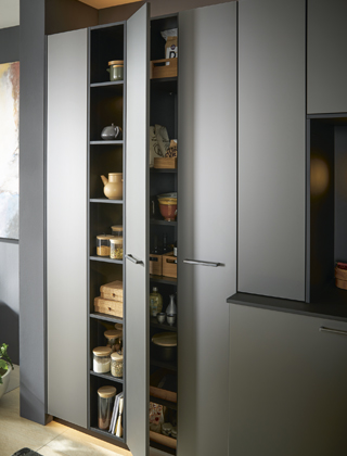 Foto: SchüllerPotravinová skříň ze sestavy (Schüller), povrch matné polymerové sklo Smartglass → www.casamoderna.cz