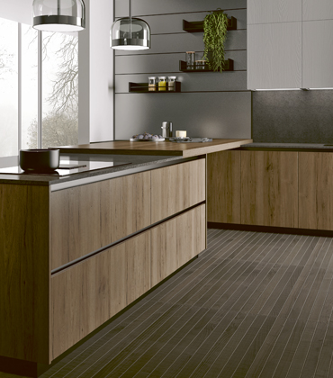 Díky super matným povrchům sluší moderním kuchyním i tmavé barvy. Módní jsou zejména odstíny šedé, černé a také tmavší a tlumené tóny zelené nebo hnědé. Všechny tmavé barvy zateplí a oživí prvky s dekorem dřeva. Rehabilitace se dočkaly i tmavé odstíny dřeva, které na větší ploše působí majestátně a luxusně.