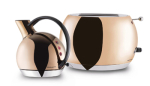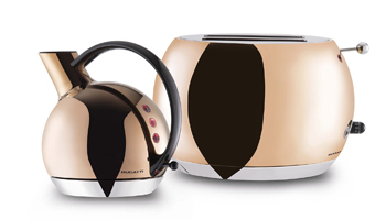 Foto: BugattiRomeo a Giulietta (Bugatti), toustovač a rychlovarná konvice oblých tvarů s růžově zlatavým povrchem, cena toustovače 7 744 Kč, konvice 7 159 Kč → www.casabella.cz