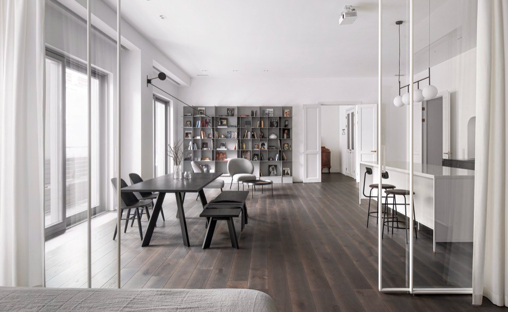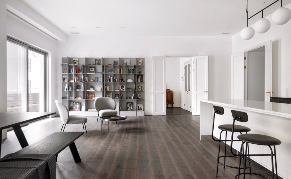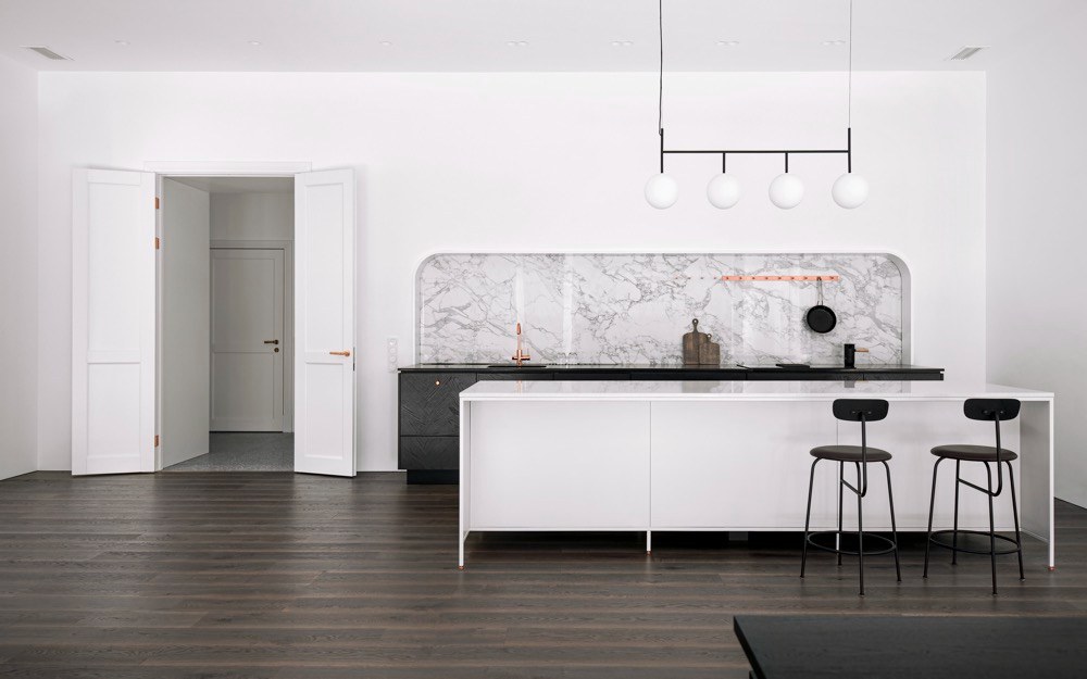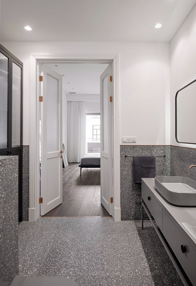 Kontrast, prostorová vzdušnost a čistý až doslova puristický styl jsou dozajista elementy, které hýbou tímto velmi nadčasovým interiérem. Osobně kladně hodnotím propojení minimalistických čistých linií s klasickými solitérními prvky v podobě historických komod, tvaru volně stojící vany a masivních vyřezávaných dveří propůjčující interiéru jistý způsob osobitosti a vřelosti. Stejně tak jsem nadšená z nádherné dubové masivní podlahy v příjemném čokoládovém odstínu v kombinaci s terrazzo dlažbou, jež od sebe oddělují elegantní měděné lišty. Měděné elementy obecně jsou detaily v tomto interiéru, které kladně kvituji, neb vnáší do prostoru určitou dávku tepla a „chic feelingu“. Rovněž centrální uspořádání layoutu bytu s obývacím prostorem v čele je velice pozitivní faktor, umožňující vcházet dovnitř velkému množství přirozeného světla. Na druhou stranu však na mne interiér působí velmi chladným až sterilním dojmem. Ačkoli architektonicky bravurně pojatý – z lidského hlediska určitým způsobem neútulný a nekomfortní k běžnému způsobu žití. Přičemž by stačilo do interiéru zakomponovat trochu více měkkých textilií, koberců, zvolit teplejší odstín bílé, vysoké stropy lehce opticky snížit jednoduchými reliéfními římsami – a hnedle by daný prostor působil mnohem přístupnějším, přátelštějším dojmem – nikoli jako perfektně nainstalovaná „výstavka“ v showroomu. Pravděpodobně však aktuální výsledek počinu byl konkrétním záměrem investora a architektů, tudíž mi úplně nepřísluší vyzařující atmosféru dogmaticky soudit.