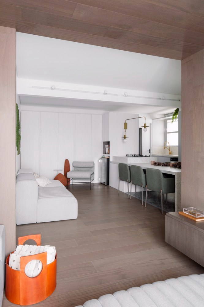 Nádherná ukázka toho, co všechno se dá citlivě skloubit a také vtěsnat do nevelkého prostoru. Nechtěla jsem zprvu věřit, jak malou metráž některé prostory ve skutečnosti mají! Líbí se mi spousta velmi umně skrytých úložných prostor v základní bílé a světle šedé, které pak o to víc dají vyniknout zajímavým detailům a akcentům. Nacházíme je ať už v podobě efektních svítidel, zlatých kovových prvků, úžasné barevné „posprejované“ koupelny, zaoblených tvarů čalounění nebo motivu vertikálních proužků, které krásně projdou celým interiérem a vytvoří důležitou spojovací linku zdánlivě nesourodých prvků. Celek je tu prostě víc než jen suma jeho částí. Má to promyšlenou funkčnost, dotažené detaily, moderní střih i brazilskou lehkost. Tomu říkám ano!