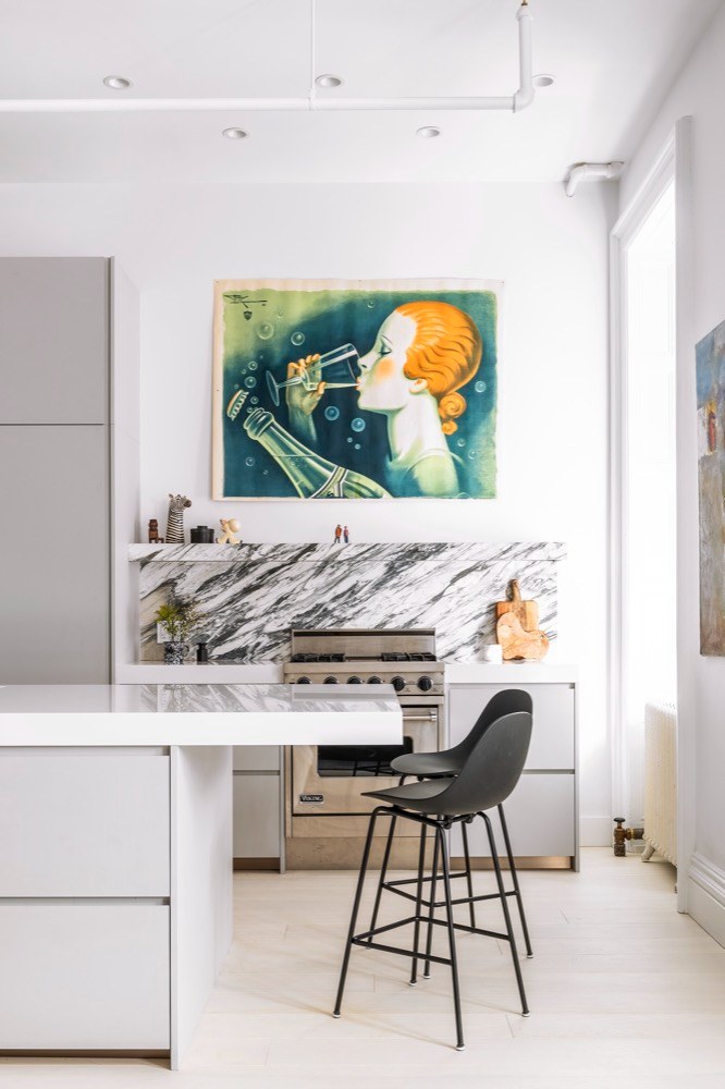 Velký prostor je zdařile vyplněný barevnými obrazy. Neobvyklá kombinace kamene a překližky, která je použita v nábytku, dává prostoru alternativního ducha. Líbí se mi originalita a kombinace barev v nábytku. Nábytek i sedací souprava v obývacím pokoji na mě působí poněkud tvrdě. Oproti tomu kuchyň je jemná a vzdušná, tudíž se v prostoru mírně ztrácí. Tento prostor bych tak striktně neoddělovala, spíš bych ho vzájemně propojila. Celek vyznívá přitažlivěji díky ponechání tradičních industriál-ních prvků, jako jsou radiátory a další technické vybavení.