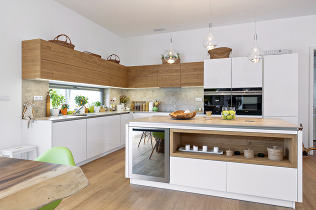 Za hladkými, vysokými dvířky se však může skrývat bar, domácí vinotéka, pracovní kout, spíž nebo i plnohodnotná kuchyň. Stačí jeden pohyb – a všechno se ukryje za čistou linií, která interiér zklidní a zorganizuje. Tento přístup odpovídá touze po minimalistickém, ale zároveň praktickém bydlení, kde má vše své místo – i když ho na první pohled nevidíte.