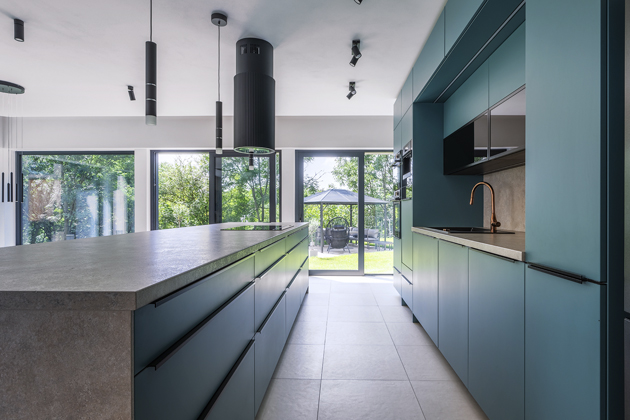 Foto: JN InterierRealizace kuchyně (JN Interier), v níž vizuálně propojuje obývací a kuchyňskou část hluboký azurový odstín použitý na lakovaných plochách skříněk, čalounění židlí a dalších akcentech → www.jninterier.cz