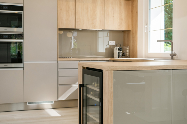 „Kuchyně v domě Zdeňka Hrubého je typem návrhu, kdy klient do studia přijde s již připraveným konceptem kuchyně od interiérového ateliéru. Při výběru nábytku jsme ocenili, že návrh byl podán rámcově tak, aby bylo možné jej upravovat a po konzultaci s budoucími uživateli měnit. Po skutečném zaměření místnosti a poradou nad barvami a dekory povrchů dvířek a proveditelnosti návrhu jsme se s Gábinou a Zdeňkem dohodli na výsledné variantě. Oproti konceptu je tam několik změn, které reagovaly na skutečné zaměření prostoru a na finální umístění vybraných spotřebičů,“ vysvětluje architekt. „Kuchyň je navržena minimalisticky v teplých odstínech dekoru Silk Touch Cappuccino a novinky Tree Talk Dub Strong Way, který je použit také na orámování nástavců kuchyně ke stropu a na pracovní desku. Na této kuchyni je použito několik atypických prvků – opláštění vinotéky, dvířka s nalepeným skutečným sklem, nástavce nad vysoké skříně, které dovolují řešení do stropu a linka je díky nim sestavená na míru danému prostoru i přání majitelů“ dodává.