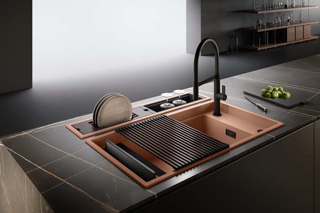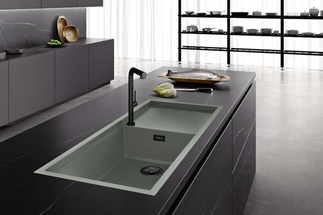 Sintesi (Elleci), dřez z materiálu Keratek umožňuje z mycího centra udělat zajímavý estetický prvek, zároveň nabízí možnost instalace doplňků, jako je excentrické ovládání odpadu nebo dávkovač saponátu, cena 13 690 Kč → www.ellecicr.cz