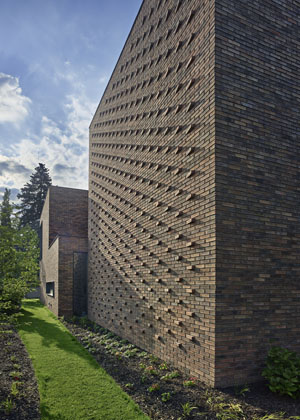 Foto: Filip ŠlapalCihlové fasáda domu je většinou hladká, v místech terasy s nenápadnými průduchy. Výjimku tvoří boční stěna s hroty. Jak to vzniklo?