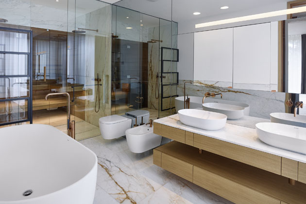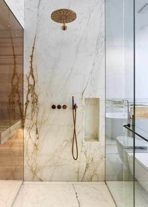 Na kamenný obklad jsme mysleli od začátku. Představovali jsme si něco s kresbou, mramor, ale spíše klasickou bílou Calacatu. Pak se objevil tento jeden jedinečný kámen a klientovi se nesmírně líbil. Byl to opravdu výjimečný kus a my mu přizpůsobili celkové řešení koupelny, včetně instalací z lesklé mědi.