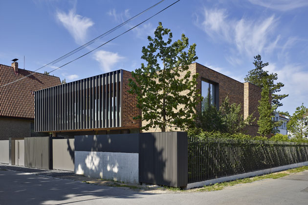 Výrazným prvkem jsou kovové lamely kryjící terasy.