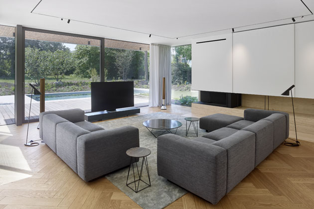 Dům zvenčí i uvnitř sází na charakterní materiály a obrací se k samotné podstatě architektonického tvarosloví. Zrcadlí životní styl svých obyvatel i emoce daného místa a přesně tak to má být. Ohromí otevřeností a dynamikou prosvětlení, žádoucí intimitu najdou obyvatelé za vertikálními lamelami stínícími velké prosklené plochy v patře. Přízemí tolik soukromí nepotřebuje. Jde o společné prostory, jejichž velkorysost formuje kontinuální území pro celou rodinu a které se otevírají do zahrady, aby ji přijaly jako další plnohodnotnou místnost. Interiér domu je pragmatický, minimalistický a napovídá, že prostor pro život tu má větší hodnotu než nashromážděné věci. Mě by nutil zanechat v něm stopu – zasadit květiny, vyskládat knihy, sem tam pověsit obraz, ale uznávám, že tu překvapivě nijak zásadně nechybí.