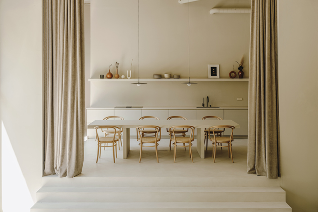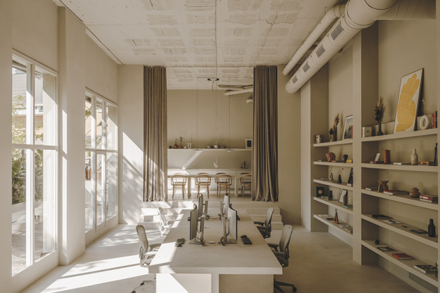 Přišli s jasnou představou, kterou do reality přenesli společně s interiérovým studiem Isern Serra. Dvoupatrový prostor má vysoké stropy, velká prosklení, je ve světlých tónech a využívá přírodní materiály. Studio se rozhodlo použít židle č. 30 od společnosti TON a také různé objekty, které zadavatel využívá ve svých digitálních projektech.
