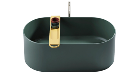 Nábytkové umyvadlo Antao Vanity (Villeroy & Boch), design studio Kaschkasch, materiál TitanCeram, povrchová úprava CeramicPlus pro snadnou údržbu, barva Morning Green, více barev, mat, 120 × 50 cm, orientační cena 50 000 Kč → www.siko.cz