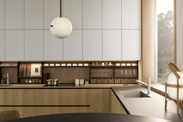 Foto: ErnestomedaSign 01 (Ernestomeda), kuchyň s důrazem na sofistikovaná řešení, ať už je to úložný prostor na náčiní integrovaný pod posuvným bar pultem, částečně otevřené nástěnné moduly, nebo spíž skrytá za hradbou vysokých skříní → www.cskarlin.cz