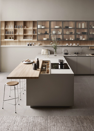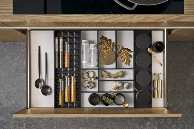 Take It Out (Nolte Küchen), zásuvkový organizér s odnímatelnou příborovou částí určený pro kuchyně z řady Nolte Neo, materiál jasanové dřevo → www.nolte-kuechen.com