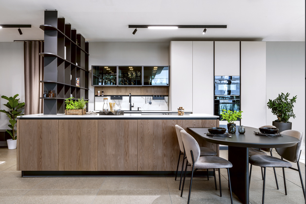 Systém vysokých skříní využívajících prostoru od podlahy po strop je maximálně praktickou záležitostí z hlediska úložné kapacity i možnosti koncentrace zásob potravin v dosahu vestavěných spotřebičů, jako jsou pečicí trouby nebo domácí konvektomaty, které mají za úkol je dále zpracovat.
