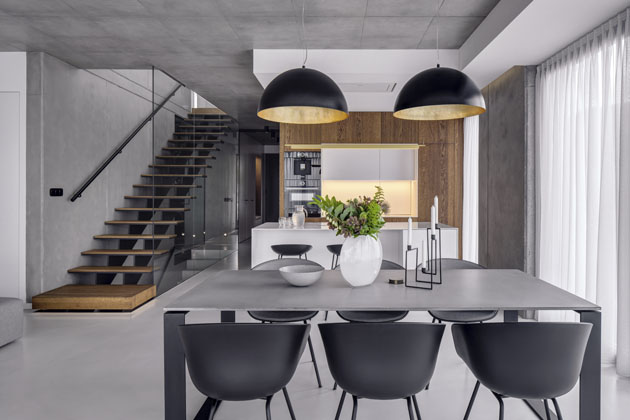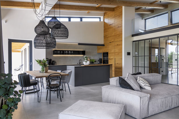 U rodinných domů a bytů preferujeme jednolité podlahy, například stěrky nebo světlé velkoformátové dlažby. Dřevo na podlaze vítáme, ale pak s ním šetříme v nábytku, obkladech stěn či stropu. V nábytkových projektech běžné cenové relace se osvědčil materiál PerfectSense Matt – odolný povrch, který nepodléhá otiskům prstů. Místo kamenných desek volíme kompaktní lamináty, jež nabízejí podobné detaily a jsou ideální pro rozpočtově omezené projekty.
