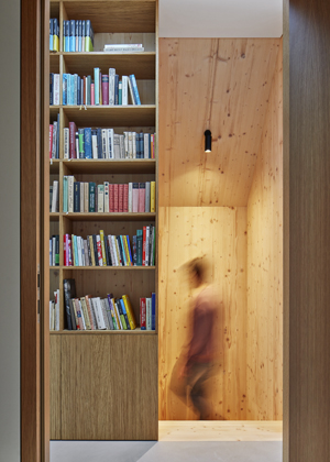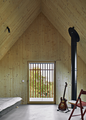 V přízemí na úrovni zahrady jsou dvě garsonky se samostatnými vstupy a část hlavního bytu pro rodinu – vstupní prostor, technické zázemí a obývací pokoj s kuchyní. V podkroví se nachází ložnice, pracovna a koupelna hlavního bytu. „Důraz byl kladen na maximálně jednoduché hmotové řešení. Štíty pohledově vystupují coby jasně definované trojúhelníky a jsou zvýrazněny světlými dřevěnými stínicími prvky.