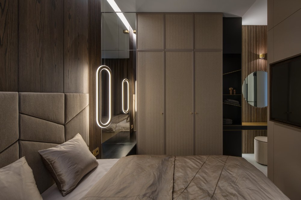 Hlavní ložnice má k dispozici samostatnou toaletu včetně vany v prostoru šatnu. Za skrytými dveřmi v rámci šatny se nachází nezbytná technická komora, kam se podařilo dostat vše, co má zůstat očím skryté. Zadáním byly přírodní materiály v zemitých….
