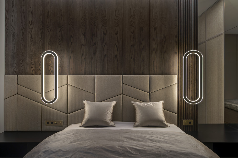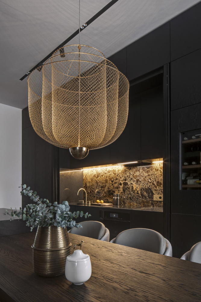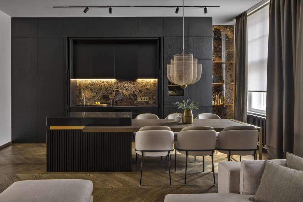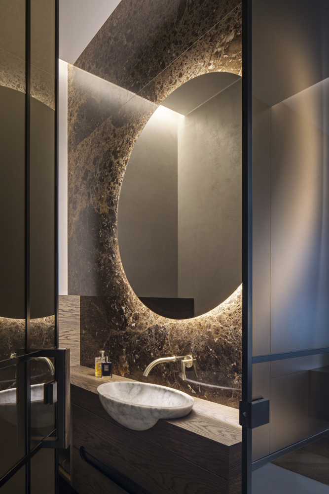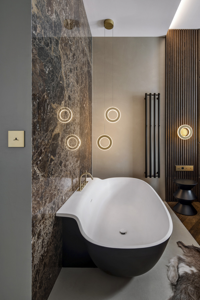 Desek bylo omezené množství a poskládat obklady tak, aby se musely co nejméně dělit, měly únosnou hmotnost a pokryly všechny preferované plochy bylo logisticky složité, ale o to lepší dojem byl po výsledném osazení. Opakovaně se tu vyskytuje i kouřový dub, který je mořený černým olejem, aby vynikla přírodní kresba dřeva. Nepřehlédnete ani mosaz. Stálo nemalé úsilí sladit všechny kovové prvky do jedné barvy – vypínače, zásuvky, svítidla, kovové úchytky na nábytku či baterie v koupelnách a toaletách.