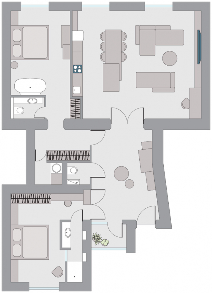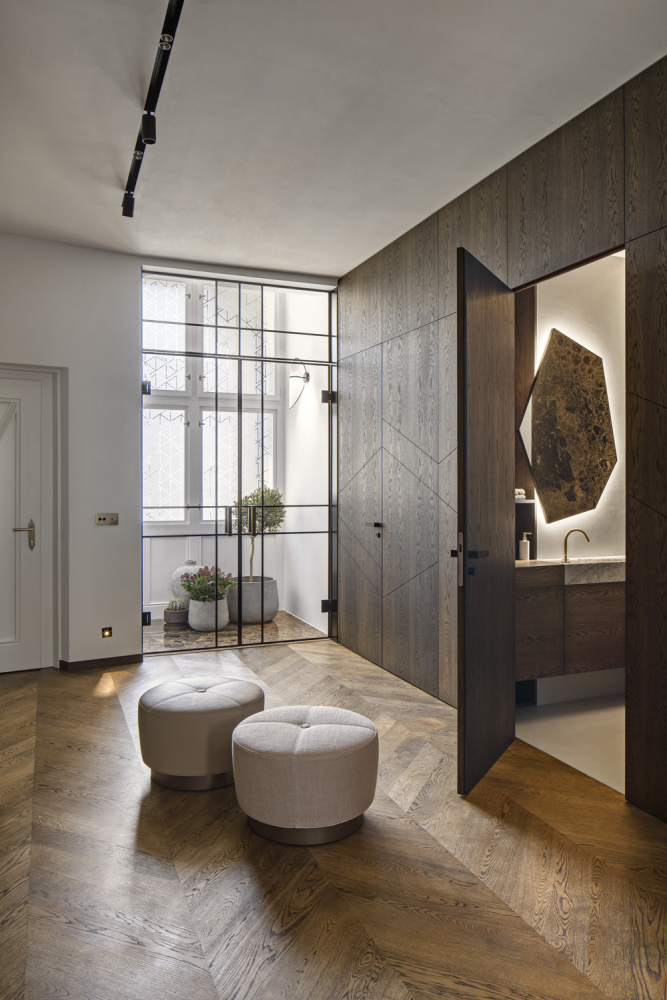 Záměrem návrhu interiéru nebylo vrátit ho minulému století, ale stejně jako v době první republiky pracovat řemeslně s každým detailem, pečlivě volit materiály, tvary i dekory. Vytvořit prostor, který by bez sentimentu odrážel styl domu, jeho vnitřní charakter a nabízel všechny atributy současného standardu bydlení rodině, která však trvale žije mimo centrum Prahy a využívá ho jen příležitostně. Rekonstrukce bytu vyžadovala zejména úpravu dispozice.