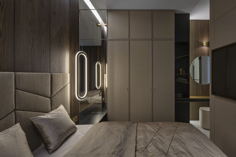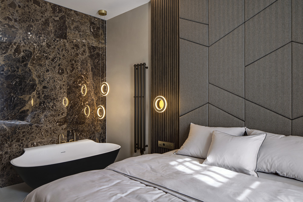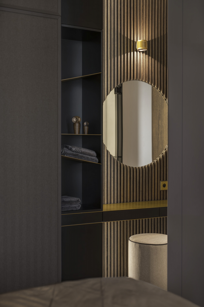 „Jedno ze svítidel se stále nedařilo dohledat v požadovaném tvaru i úpravě povrchu, tak jsme si museli pomoci i přelakováním a zapojit tři lokální firmy, než se podařilo dosáhnout požadovaného vzhledu. Dokonce i vnitřky šatních skříní drží jednotnou linii, šatní tyče jsou rovněž z mosazi, panty skříní naopak v černém titanu, aby nerušily. Mosaz pro nás byla výchozím bodem mnohého. Jediné zachované detaily byly v podobě kování na původních oknech a vstupních dveřích, ty jsme nechali repasovat a původní mosazné kličky oken i vstupní kliku jsme dali znovu odlít podle dochovaného vzoru.
