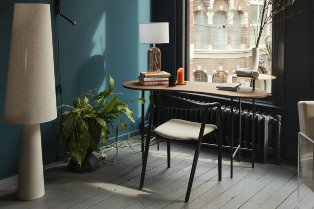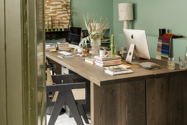V kancelářském studiu není pro interiér klíčovou vlastností styl, musíte se tu umět i soustředit. Theo-Bert Pot nám na svém ateliéru dokazuje, jak tyto dva zdánlivě protichůdné požadavky skloubit. Díky pohodlnému nábytku v jeho ateliéru se budete okamžitě cítit jako doma. "Ujistěte se, že stůl, u kterého pracujete, je útulný. Nebo oživte prostor kombinací různých židlí. Neříká se nadarmo, že relaxovat a pracovat v krásném prostředí obohatí vaši kreativitu!“ dodává Theo-Bert Pot. A jaký je jeho stylingový plán v kostce? Vnímejte prostor a přemýšlejte o tom, co s ním chcete dělat. Barva dokáže s prostorem hodně udělat. Zkuste najít kontrasty, například kombinací grafické tapety s jednobarevnou barvou. Pokud se barev bojíte, experimentujte s ní na chodbě, kde si vyzkoušíte, jaké to je mít například barevný strop ve vaší kanceláři.