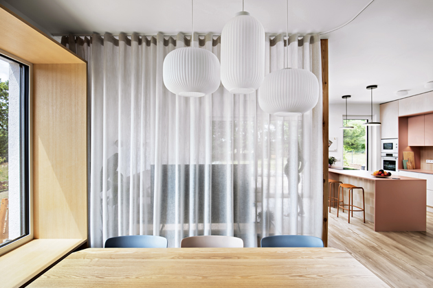 První, co odborníci z brněnského studia POSTROP udělali, bylo, že z původního návrhu vymazali téměř všechny příčky a vytvořili v přízemí velký otevřený prostor, který lze díky lehkým závěsům od podlahy až po strop variabilně členit podle aktuálních potřeb a programu jednotlivých členů rodiny. Pro majitele to byl jeden z klíčových bodů v zadání pro studio, protože oba často pracují z domova. Ruku na srdce, občasné soukromí je navíc neodmyslitelnou součástí rodičovské sebepéče.