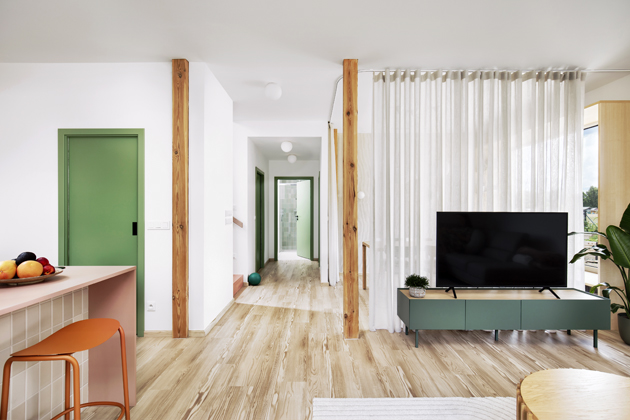 studio POSTROP, které vytvořilo pro mladou rodinu s dětmi otevřený a zároveň nesmírně variabilní prostor. Hravou „skládačku“, jež jim umožní trávit čas pospolu i každý sám ve svém tichu.