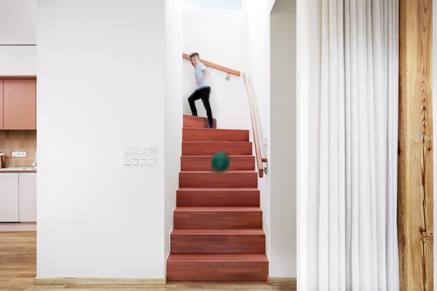 Foto: Kubíček.StudioKdyž jsem poprvé stál v hotovém interiéru, došlo mi, že to není o barvách, ale o všech strukturách, přiznaných texturách, použitých materiálech a uklidňujícím dojmu, který tvoří.“ S tím souhlasí i samotní majitelé, kteří zároveň přiznávají, že by je ani ve snu nenapadlo, že budou bydlet v domě s růžovou kuchyní a zelenými dveřmi. Kdyby si interiér zařizovali sami, skončil by pravděpodobně v neutrálním šedobílém ladění okořeněném maximálně o prvky ze dřeva.