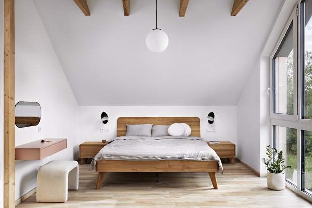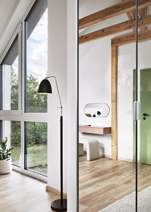 I obyčejně stísněné schodiště zde získává na vzdušnosti a otevírá výhled do okolí a na zelenou střechu osázenou květinami. Z obývacího pokoje stačí udělat pár kroků a majitelé se ocitají na prostorné terase, v dokonalém venkovním zázemí, na které příhodně navazuje zahrada s jezírkem a saunou.