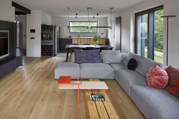 Zmíněná černá ocel a přírodní dřevo (dubové podlahy jsou sladěné s barvou trámů) spolu se šedobílými štuky a omítkami spoluvytvářejí (troj)barevnou střízlivost interiéru. Barvy ctí i dominantní prvky zařízení, jako prostorné pohodlné sezení Sancal - Mousse se šedým potahem či elegantní černý jídelní stůl. „To byl záměr vytvořit neutrální základ. Dobarvili jsme ho drobnými, obměnitelnými prvky, jako jsou třeba polštáře. V pokojích dcer je zase růžová stěna, která, když se s přibývajícím věkem omrzí, tak se také lehce přebarví.“