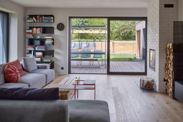 „Bylo mi líto toho množství dřeva, tak jsme většinu využili - v exteriéru na vyvýšené záhony, částečně je z něj i pergola a pokračovali jsme vstupními schody do domu. V interiéru jsme pak na tento prvek navázali třeba předstupni pod hlavním ocelovým schodištěm,“ vypočítává ing. arch. Tereza Čudová Ajmová - ve stejném designu je i originální konferenční stolek v obýváku, poskládaný ze tří rovnoběžných trámů, prostě ani trám nazmar.