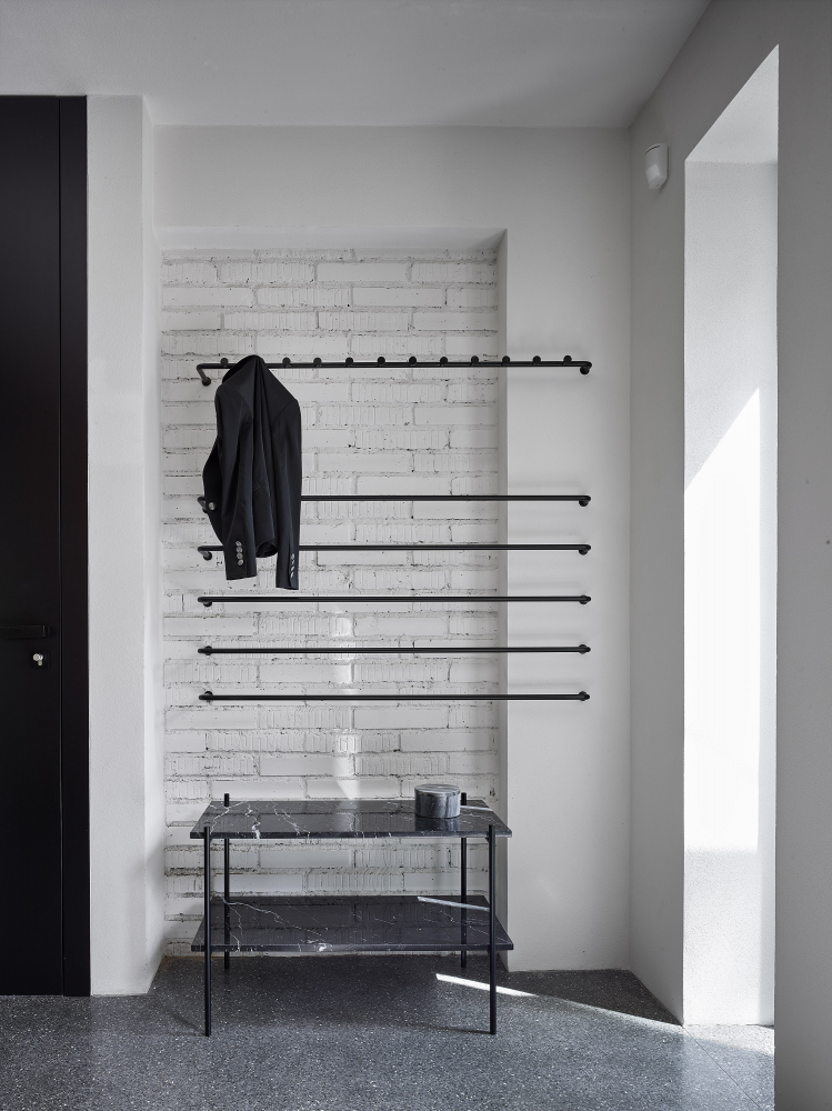 „Kreslila jsem mnoho atypických prvků. Třeba stěna za televizí je ze surového ocelového plechu, do kterého jsme laserem vyřezali perforování. Nechtěla jsem ho nechat z plné oceli, aby nepůsobil tak masivně. Z černého ocelového plechu je i vinotéka, takový barový zásobník na víno, věšáky v zádveří nebo koupelnové prvky zase z ocelových prutů,“ pokračuje autorka rekonstrukce.