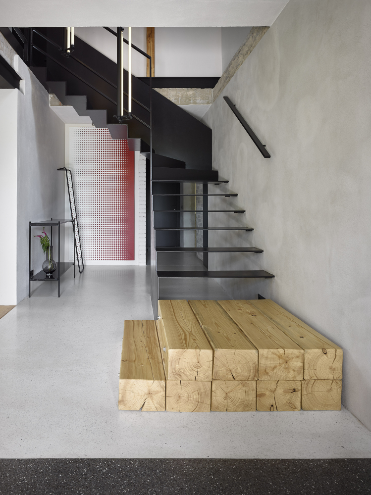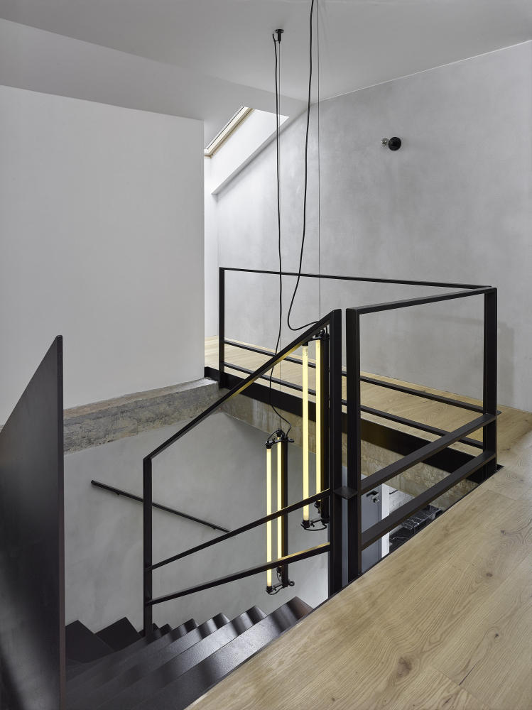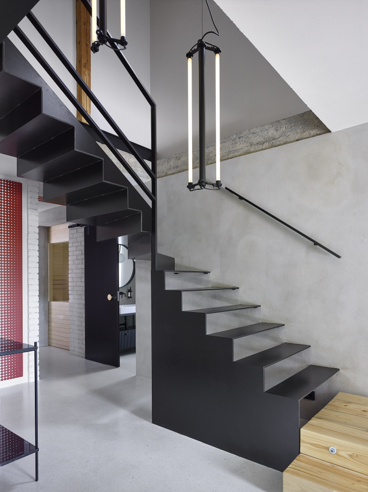 Ostatně z 12 mm ocelových plátů řezaných laserem je i hlavní zavěšené schodiště, které nahradilo původní zděné. „To byl konstrukčně nejnáročnější prvek. Připravila jsem výkresy i 3D model, podle kterých jsme vše nechali vyřezat na laseru, takže se schodiště snadno sestavovalo jako skládačka. Ale přestože vypadá vzdušně, ocel je sama o sobě těžká a schodiště vážilo přes půl tuny... Když jsem pak viděla zámečníky, jak ty jednotlivé díly tahají a navařují ručně, protože žádnou mechanizaci dovnitř nedostali, tak to byl z jejich strany opravdový majstrštyk,“ chválí řemeslníky.