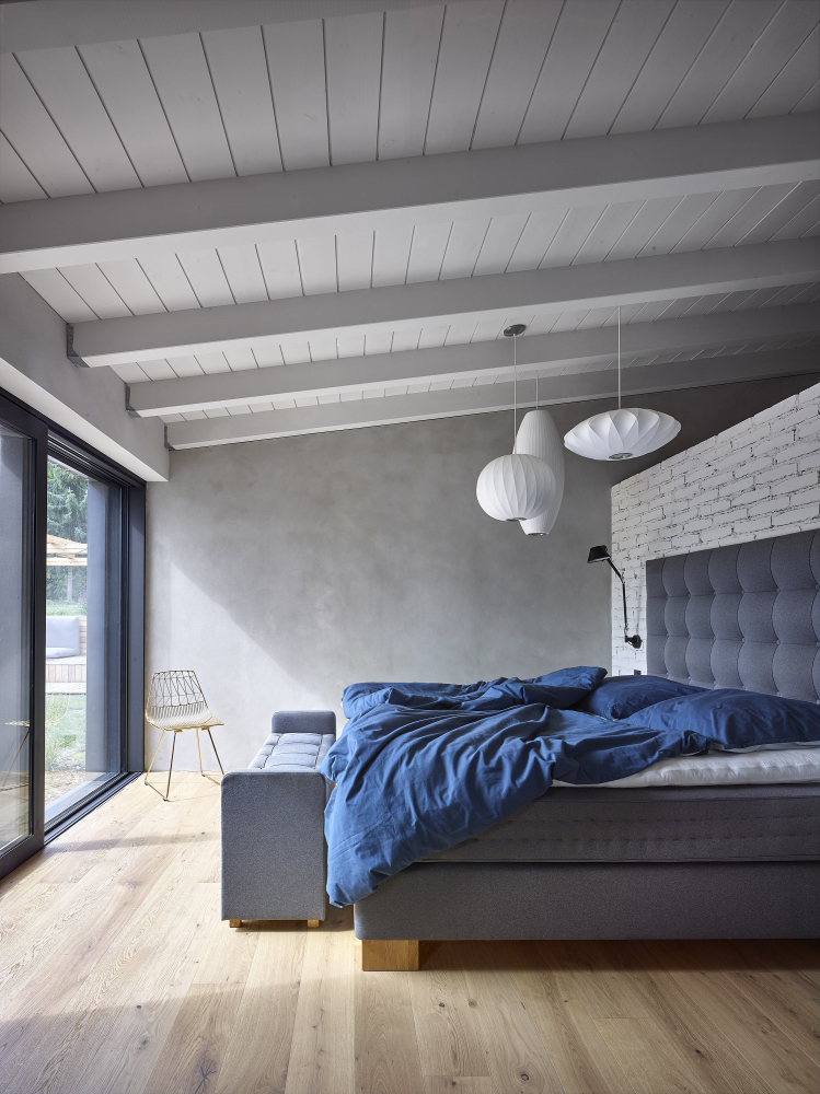 Zvolený světlovod VELUX je však důkazem promyšlenosti každého detailu - ložnici totiž odděluje od šatny příčka, která nedosahuje až do stropu. „Pokud bychom nad šatnou udělali klasické střešní okno, tak tím, že dělicí příčka nejde až ke stropu, by majitelům ráno přes šatnu svítilo do postele sluníčko a budilo by je. Proto jsme zvolili světlovod a dali ho do tubusu tak, aby spodní hrana tubusu vyústila níže, než je horní hrana příčky - světlo tedy jde jen do šatny. Samozřejmě něco málo se odrazí, ale není to tak, že se probouzíte a nad vámi svítí koláč ranního slunce,“ okomentovala poslední detail ing. arch. Tereza Čudová Ajmová.