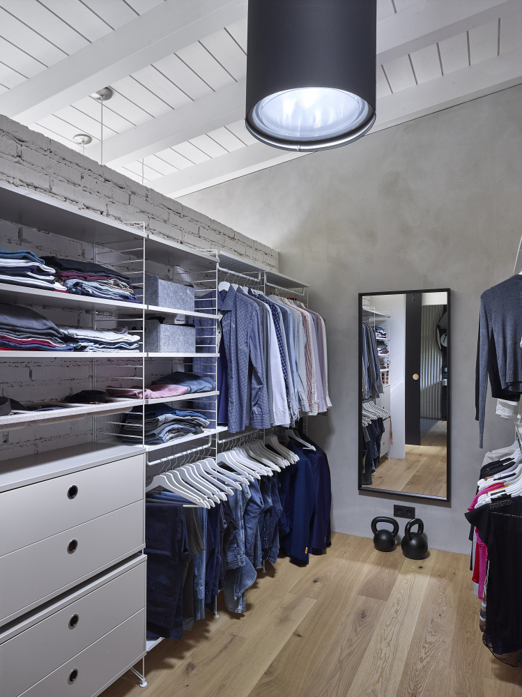 Pro horní šatnu mezi pokoji dcer střešní okno použít nešlo, protože nad šatnou je malá půda, proto architektka zvolila světlovod: „Nechtěla jsem, aby šatna byla závislá jen na umělém osvětlení, tak jsme světlo přivedli světlovodem.“ Po něm nakonec sáhla i v šatně přízemní jednopodlažní budovy, která navazuje na ložnici majitelů, ač tady se naopak na první pohled nabízelo spíše střešní okno v nové pultové střeše.