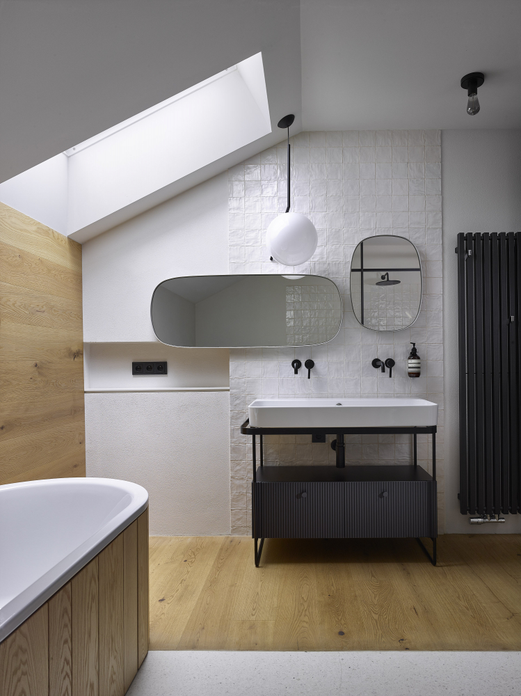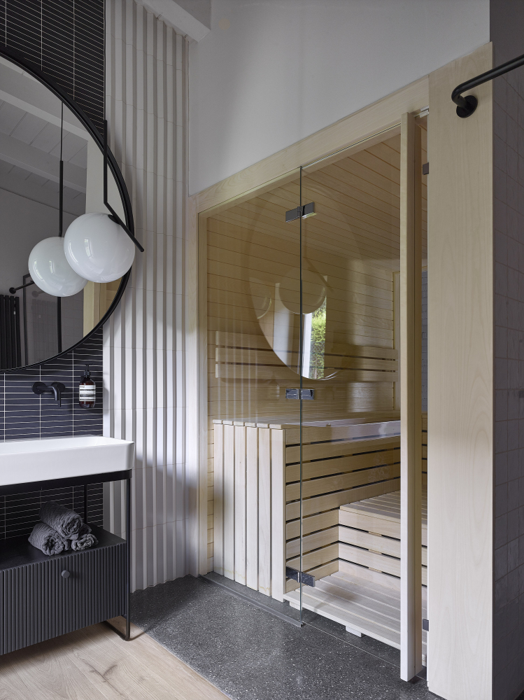 Přirozenost je podstatou celého návrhu, (přirozené) světlo nevyjímaje. „Pro mě je světlo alfa a omega a je to vidět na realizacích, přirozené světlo dělá velkou část interiéru. Pokud rekonstruujeme, většinou zvětšujeme okna a snažím se dostat přirozené světlo i do míst, kde to lidé většinou neřeší. Platilo to i pro tento dům. Například v dětských pokojích byla původně tradiční okna s parapetem, tak jsme je protáhli k podlaze, to samé jsme udělali s okny v obývacím pokoji. Saunu jsme zase prosklili ze dvou stran, abychom skrze ni pustili přirozené světlo do chodby. Schodišťový prostor jsme prosvětlili motoricky ovládaným střešním oknem, stejně tak horní koupelnu. Pro ni jsem si vzhledem k vlhkosti prostředí nechala doporučit bezúdržbové okno VELUX, tedy bílou polyuretanovou vrstvou potažený dřevěný rám.“