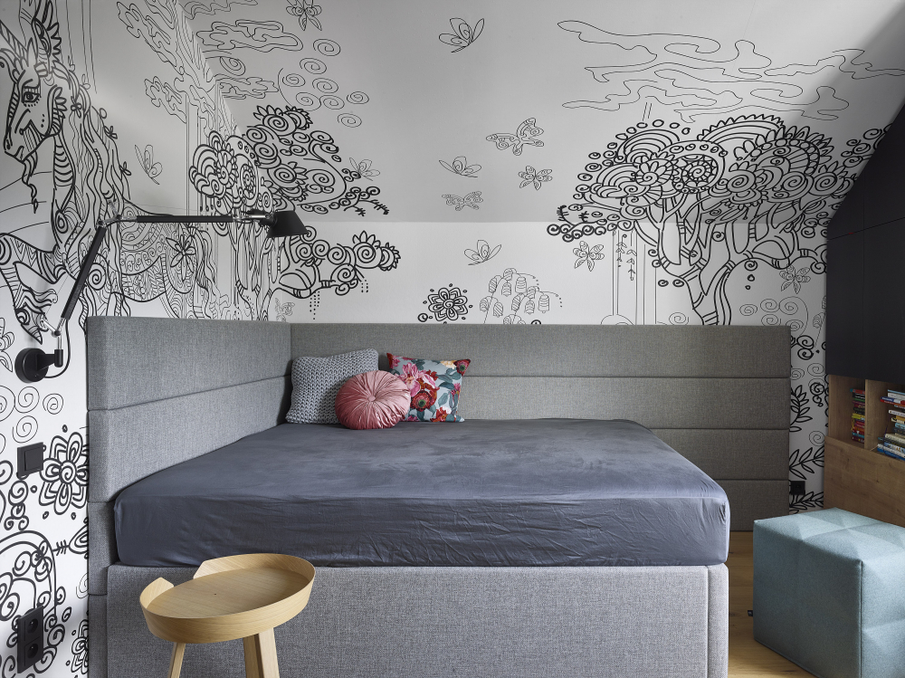 Až na barevné výjimky v pokojích obou slečen jsou tedy stěny v ostatních částech domu laděny lehce do šeda. „Chtěla jsem ponechat interiér jen vyštukovaný, protože štuk je trochu flekatý a vidíte v něm tu živost. Když ho přemalujete malířskou barvou, vznikne jednolitá unylá barva, nevidíte ty tahy, jak to štukovali řemeslníci. Někde ale štuk ponechat nešlo, tak jsme použili šedobéžovou výmalbu.“