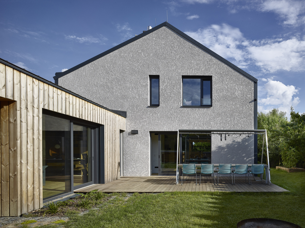 Podobnou přirozenost požadovala architektka i od venkovní omítky, nespokojila se s až strojově uhlazenou „klasikou“. „Měla jsem představu vytvořit vizuálně takovou strukturu, jakou mají staré stodoly nahozené vápnem, na kterých je vidět přirozenost a nepravidelnost ruční práce řemeslníků. Konzultovala jsem to přímo s výrobcem a nakonec jsem to vyřešila tak, že jsem zašla na stavbu, když se natahovala omítka, a různými postupy - koštětem i malířskou štětkou jsme zkoušeli omítku narušit. Podařilo se to malířskou štětkou, kterou zedníci do omítky „ťupkovali“ a vytvořili strukturu podle mých představ,“ vzpomíná architektka a s úsměvem dodává: „Trošku si tedy při tom ťukali na hlavu, co jsem to vymyslela, ale udělali to...“