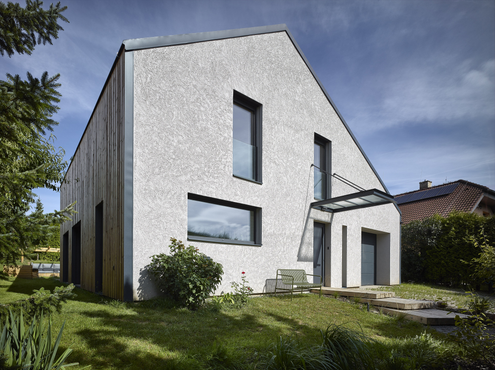 Podobně architektka „odsekla“ balkonek nebo trojúhelníkový arkýř u hlavní budovy v místě obývacího prostoru. „ Co vybočovalo, to jsme ubourali a zarovnali, aby objekt získal obdélníkové tvary. Platí to i pro přesahy střech. Aby dům nevypadal jako selská chalupa nevhodně zasazená do příměstské lokality, ořezali jsme všechny přesahy a výsledkem je hladký štít,“ pokračuje architektka.